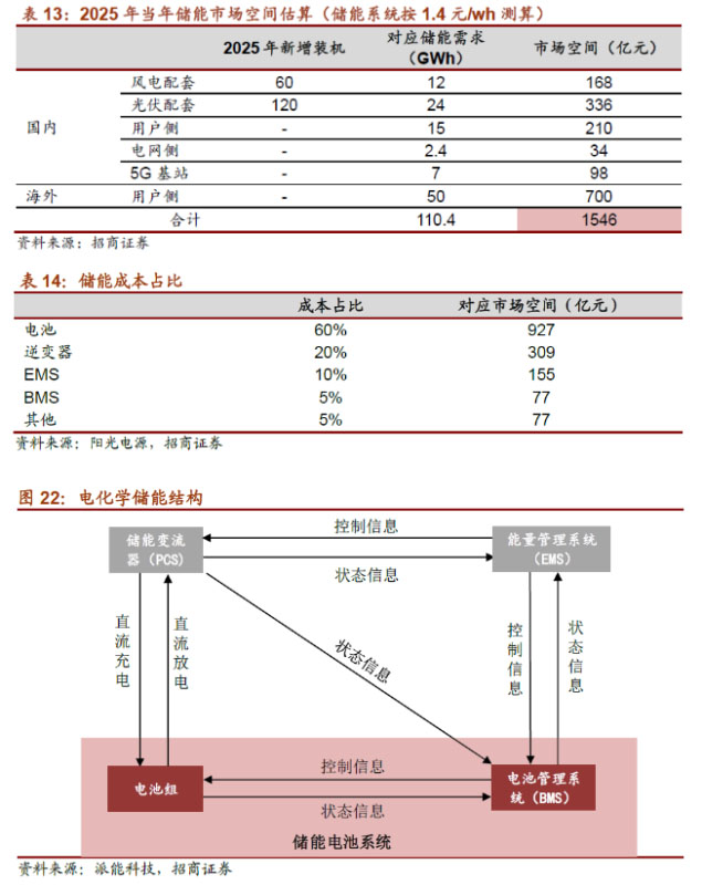 2025年全球儲(chǔ)能市場空間超1500億,有望接近2000億。預(yù)計(jì)2025年國內(nèi)用戶側(cè)、發(fā)電側(cè)、電網(wǎng)側(cè)、5G領(lǐng)域與國外用戶側(cè)對(duì)應(yīng)的儲(chǔ)能需求約為110Gwh,若按儲(chǔ)能系統(tǒng)1.4元/wh計(jì)算,對(duì)應(yīng)市場空間超1500億。若在此期間內(nèi)儲(chǔ)能成本進(jìn)一步下降,預(yù)計(jì)更多需求將被激發(fā),需求增加對(duì)市場空間的影響可能會(huì)遠(yuǎn)超價(jià)格下降,屆時(shí)市場規(guī)模有可能接近2000億元。