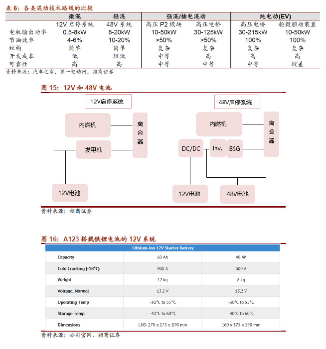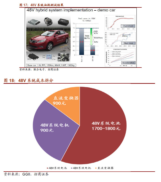 48V系統(tǒng)可以明顯降低油耗并改善駕駛體驗(yàn)。48V混合動(dòng)力系統(tǒng)可以實(shí)現(xiàn)滑行啟停、動(dòng)能回收、輔助加速等功能,降低油耗。根據(jù)測試,搭載48V系統(tǒng)的混動(dòng)車型在歐洲油耗及排放評(píng)定標(biāo)準(zhǔn)NEDC的工況下,可以實(shí)現(xiàn)10%-15%的油耗降低。同時(shí),隨著汽車電子化滲透率加速,原有電壓平臺(tái)也無法適用,此外,48V系統(tǒng)對(duì)汽車的加速、剎車響應(yīng)方面也有提升,整體的駕駛體驗(yàn)也會(huì)有較大幅度的提升。