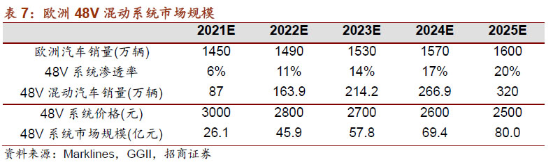 48V混動(dòng)系統(tǒng)順應(yīng)嚴(yán)苛的油耗政策,未來市場規(guī)模巨大。目前世界各國對(duì)于油耗政策的要求愈發(fā)嚴(yán)苛,到2020年,中國規(guī)定乘用車新車平均油耗要控制在5.0L/100km以下,歐洲規(guī)定乘用車平均油耗要控制在4.0L/100km以下;到2025年,美國規(guī)定乘用車油耗應(yīng)在3.9L/100km以下。對(duì)于車企來說,節(jié)能減排的壓力巨大,而性價(jià)比高、節(jié)能效果明顯的48V微混就變成了滿足油耗政策下的首選。按照目前新能源汽車發(fā)展的路徑來看,未來48V系統(tǒng)有望復(fù)制其高速增長,以歐洲市場為例,預(yù)計(jì)至2025年搭載48V混動(dòng)系統(tǒng)的車輛有望達(dá)到320萬輛,對(duì)應(yīng)的市場規(guī)模將達(dá)80億元左右。