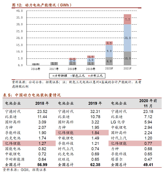 2021年公司有較高的增長確定性。公司的鋰原電池具有全球領(lǐng)先的競爭力,小型鋰離子電池通過深度切入全球電動(dòng)工具市場進(jìn)而進(jìn)入國內(nèi)第一陣營,而金豆等微型鋰離子在歐洲與中國市場都獲得專利戰(zhàn)勝利,總體看,公司小電池領(lǐng)域競爭力得到加強(qiáng),未來有望保持高質(zhì)量的較快增長;而在2021年,因?yàn)閳A柱形電池產(chǎn)能翻倍以上增長,增長會(huì)加速。動(dòng)力電池方面,公司持股51%的億緯集能主要產(chǎn)品為軟包動(dòng)力電池,2010年初產(chǎn)能3GWh,2021年初已達(dá)10GWh;同時(shí),公司持股30%的SK新能源(江蘇)目前具備10GWh產(chǎn)能,并在擴(kuò)建17GWh新產(chǎn)能。億緯集能與SK新能源江蘇公司主要客戶為海外標(biāo)桿客戶,目前生產(chǎn)供應(yīng)都很緊張,伴隨產(chǎn)能陸續(xù)投放,軟包電池有望實(shí)現(xiàn)大的增長與利潤貢獻(xiàn)。公司鐵鋰電池產(chǎn)能過去一年多實(shí)現(xiàn)數(shù)倍擴(kuò)產(chǎn)并達(dá)到10GWh產(chǎn)能,伴隨商用車恢復(fù)及儲(chǔ)能等市場發(fā)展,鐵鋰業(yè)務(wù)貢獻(xiàn)也會(huì)更突出。