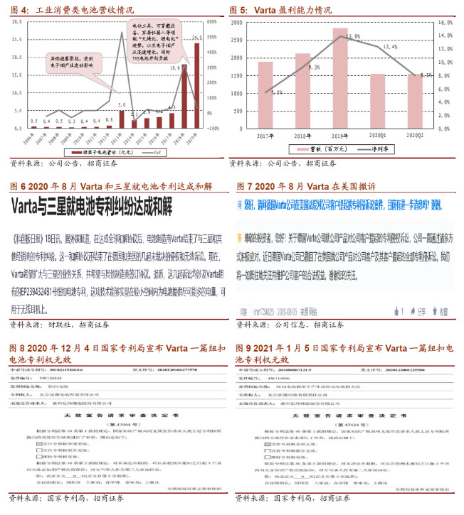 億緯鋰能“金豆”電池迎來收獲。2019年底公司已經(jīng)開始啟動(dòng)“金豆”電池產(chǎn)業(yè)化,并切入海外主流TWS耳機(jī)品牌供應(yīng)鏈,不過在后續(xù)發(fā)展中和海外巨頭在專利方面產(chǎn)生沖突。2020年12月和2021年1月國家專利局宣布Varta的2項(xiàng)國內(nèi)紐扣電池專利無效,并且國際認(rèn)定也在推進(jìn)中,公司專利問題正在解決。