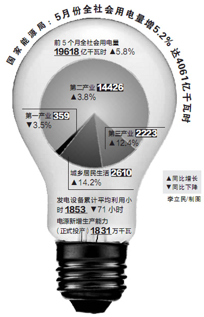 6月13日召開的2012年全國電力迎峰度夏新聞發(fā)布會公布數(shù)據(jù)顯示,今年前5個(gè)月,全社會用電量為1.96萬億千瓦時(shí),同比增長5.8%,增幅回落6.2%;5月份,全社會用電量4061億千瓦時(shí),同比增長5.2%,增幅回落5.6%。兩者均為近幾年較低水平。