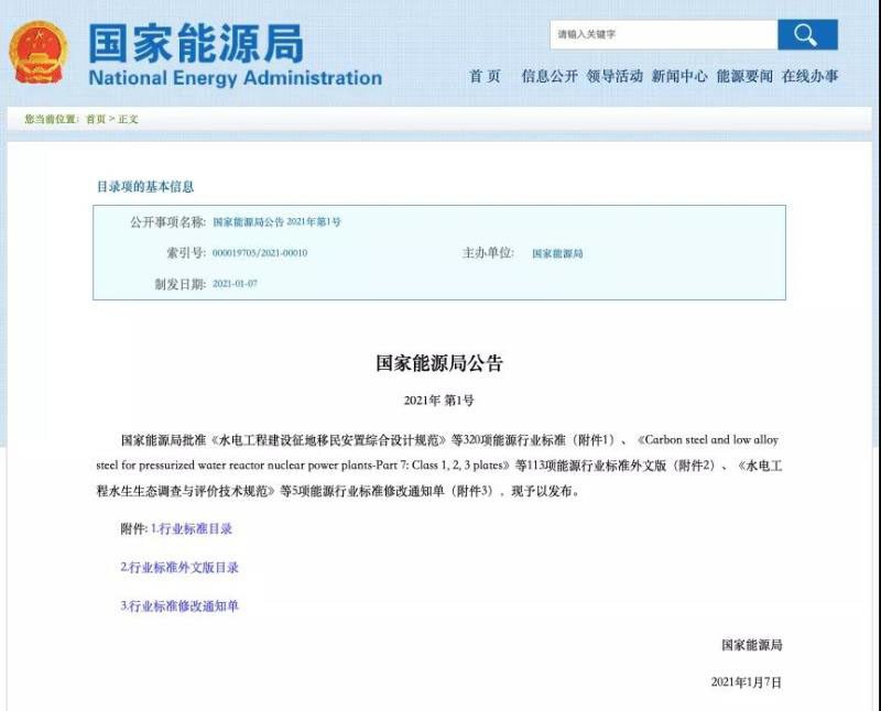 中國儲(chǔ)能網(wǎng)訊:2020年1月7日,國家能源局批準(zhǔn)《水電工程建設(shè)征地移民安置綜合設(shè)計(jì)規(guī)范》等320項(xiàng)能源行業(yè)標(biāo)準(zhǔn)、《Carbon steel and low alloy steel for pressurized water reactor nuclear power plants-Part 7: Class 1, 2, 3 plates》等113項(xiàng)能源行業(yè)標(biāo)準(zhǔn)外文版、《水電工程水生生態(tài)調(diào)查與評(píng)價(jià)技術(shù)規(guī)范》等5項(xiàng)能源行業(yè)標(biāo)準(zhǔn)修改通知單(附件3)。