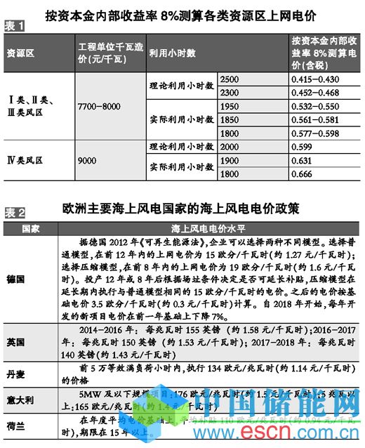 海上風(fēng)電代表著風(fēng)電技術(shù)領(lǐng)域的前沿和制高點,是世界上主要風(fēng)電市場重點關(guān)注的發(fā)展方向,也是我國戰(zhàn)略性新興產(chǎn)業(yè)的重要內(nèi)容。我國可供開發(fā)的海上風(fēng)能資源豐富,場址靠近負(fù)荷中心,海上風(fēng)電的開發(fā)利用不僅是風(fēng)電產(chǎn)業(yè)向縱深發(fā)展的關(guān)鍵一環(huán),也是帶動我國相關(guān)海洋產(chǎn)業(yè)協(xié)調(diào)發(fā)展的有效途徑,具有重要的戰(zhàn)略意義。然而沒有電價政策的支持,就無法培育出健康的海上風(fēng)電市場,沒有規(guī)?;氖袌?,就沒有技術(shù)進(jìn)步的產(chǎn)業(yè)基礎(chǔ),就難以把握住產(chǎn)業(yè)發(fā)展的關(guān)鍵機(jī)遇期。距2010年我國首個海上風(fēng)電工程東海大橋項目首期投運已有三年多時間,但我國海上風(fēng)電的指導(dǎo)電價遲遲未能出臺,這已然影響到了海上風(fēng)電的發(fā)展進(jìn)程。海上風(fēng)電特許權(quán)招標(biāo)項目并未像在陸上風(fēng)電上實施的那樣,為海上風(fēng)電標(biāo)桿電價的制定提供準(zhǔn)確的依據(jù)?!笆濉逼陂g500萬千瓦的海上風(fēng)電裝機(jī)規(guī)劃目標(biāo)的完成時間目前已經(jīng)所剩無幾,當(dāng)務(wù)之急是盡快出臺合理的海上風(fēng)電指導(dǎo)電價。縱觀海上風(fēng)電發(fā)展較好的幾個歐洲國家,都有清晰明確的單獨針對海上風(fēng)電的電價機(jī)制,且電價水平對產(chǎn)業(yè)發(fā)展形成穩(wěn)定而有力的支撐作用。(表2)其中德國在2012年修訂可再生能源法的時候,還上調(diào)了海上風(fēng)電價格,目的是最大程度地保證政策的穩(wěn)定性和電價水平的科學(xué)性。我國可參考別國經(jīng)驗、電價機(jī)制和水平,結(jié)合我國海上風(fēng)電工程實際,制定海上風(fēng)電標(biāo)桿電價。有鑒于我國海洋工程條件的復(fù)雜性,以及初期階段工程造價較高、運維費用較高的情況,海上風(fēng)電的電價支持力度不應(yīng)低于表2中所列歐洲各國的水平。