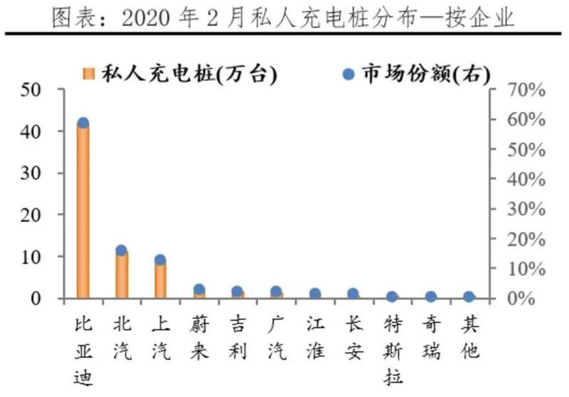 私人充電樁一般隨新能源汽車附送或購買,因而份額基本都是車企。我國又以比亞迪獨大,一騎絕塵,截至2020年2月,比亞迪運營的私人充電樁41.9萬臺,市場份額接近6成,北汽、上汽分列第二第三,分別是占比15.9%、13.1%。