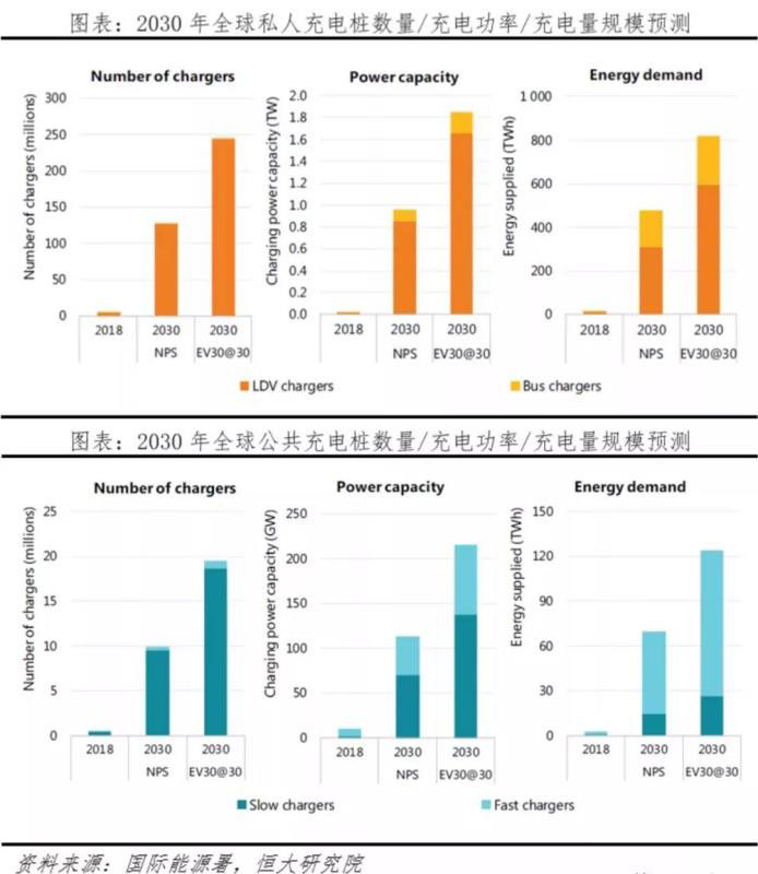 另外,從國際能源署IEA發(fā)布《Global EV Outlook 2019》報告和恒大研究院任澤平的研究上看,到2030年全球私人充電樁預(yù)計保有量分別達到12800-24500萬臺,總充電功率達1000-1800GW,總充電量達480-820TWh;公共充電樁預(yù)計保有量達到1000-2000萬臺,總充電功率113-215GW,總充電量70-124TWh。