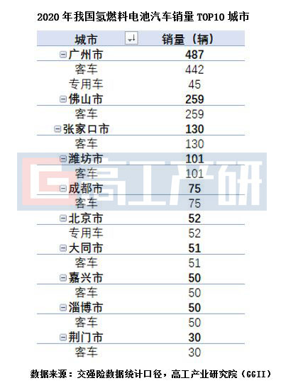 從城市分布來(lái)看,2020年我國(guó)氫燃料電池汽車(chē)銷(xiāo)量主要分布在廣州、佛山、張家口、濰坊、成都、北京、大同、嘉興、淄博、荊門(mén),該十城合計(jì)銷(xiāo)量為1,285輛,占整體的85.84%。