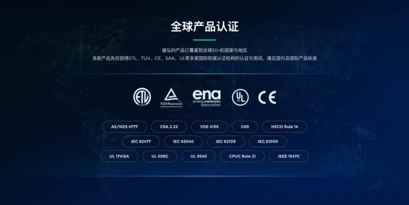為滿足不同國(guó)家地區(qū)的安全標(biāo)準(zhǔn),盛弘30-1000kW全功率范圍儲(chǔ)能變流器產(chǎn)品均已通過(guò)第三方認(rèn)證機(jī)構(gòu)認(rèn)證。根據(jù)中國(guó)、英國(guó)、德國(guó)、澳洲和美國(guó)電網(wǎng)安全規(guī)范標(biāo)準(zhǔn)進(jìn)行的測(cè)試和認(rèn)證,并在美國(guó)加州和夏威夷州電網(wǎng)公司、澳洲清潔能源協(xié)會(huì)CEC及英國(guó)能源網(wǎng)絡(luò)協(xié)會(huì)ENA上進(jìn)行列名,滿足智能逆變器對(duì)電網(wǎng)的高級(jí)支撐能力。50~250kW系列模塊化儲(chǔ)能變流器成為全球首款同時(shí)滿足UL、CPUC 和HECO相應(yīng)規(guī)范的大型并網(wǎng)逆變器,并能同時(shí)滿足并網(wǎng)和離網(wǎng)的應(yīng)用需求。此外,盛弘股份儲(chǔ)能實(shí)驗(yàn)室也同時(shí)成為Intertek和TUV萊茵所認(rèn)可的試驗(yàn)室。