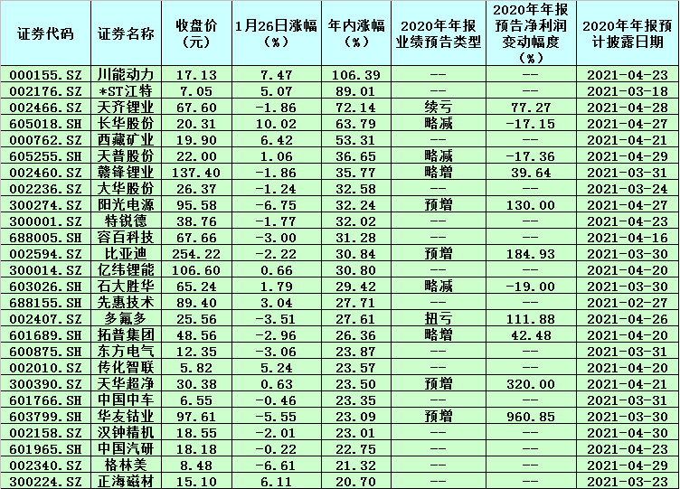 而新能源汽車(chē)的強(qiáng)勢(shì)遠(yuǎn)不止如此,從今年以來(lái)的17個(gè)交易日市場(chǎng)表現(xiàn)看,有13只個(gè)股期間累計(jì)漲幅超過(guò)30%,其中,川能動(dòng)力股價(jià)已經(jīng)實(shí)現(xiàn)翻倍,期間累計(jì)漲幅達(dá)到106.39%,此外,*ST江特、天齊鋰業(yè)、長(zhǎng)華股份、西藏礦業(yè)等4只個(gè)股期間累計(jì)漲幅也均在50%以上,分別為89.01%、72.14%、63.79%、53.31%。