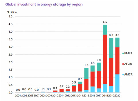 彭博新能源財經(jīng)公司的調(diào)查報告表明,亞太地區(qū)和美國儲能市場投資快速增長,而EMEA地區(qū)的投資卻在放緩
