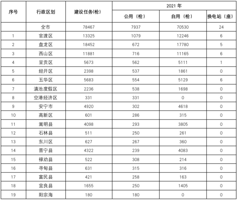 《實施方案》將2021年度全市充電基礎(chǔ)設(shè)施建設(shè)目標任務(wù)分解至19個縣(市)區(qū),包括滇池度假區(qū)、空港經(jīng)濟區(qū),其中,盤龍區(qū)建設(shè)任務(wù)數(shù)量最多,達18452槍、6座充換電站,其次是官渡區(qū)分別為13325槍、6座充換電站。