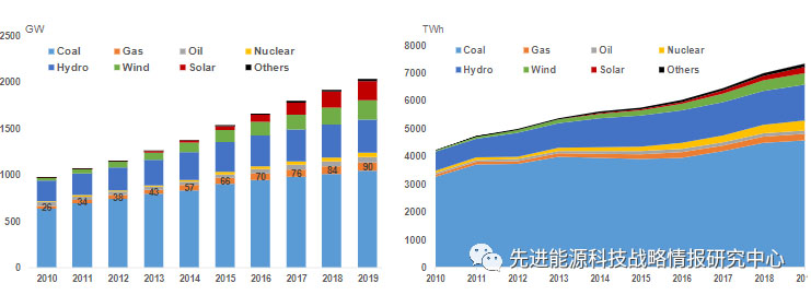 圖1 2010-2019年中國(guó)電力裝機(jī)容量(左圖,單位:吉瓦)和發(fā)電量(右圖,單位:太瓦時(shí))