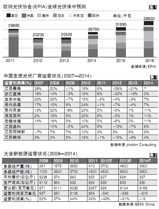 中國絕大多數(shù)多晶硅廠商前景暗淡,那么硅片、電池片、模組等下游廠商的狀況又如何呢?從去年第二、三季度開始,中國主流的光伏廠商的運(yùn)營就已經(jīng)開始出現(xiàn)赤字,而且虧損的嚴(yán)重程度在不斷加劇。更為令人不安的是,這些公司的運(yùn)營狀況有可能要一直等到2014年才能有所改善(表1)。中國公司在經(jīng)歷了2009年的低潮之后,托歐洲市場之福,2010年經(jīng)營狀況大幅改善。但盲目地?cái)U(kuò)大產(chǎn)能、一味追求“高大全”的垂直整合模式迅速導(dǎo)致了全球產(chǎn)能的過剩,這不但在歐美引起了一片抵制中國公司和產(chǎn)品的雜音而且最終還危及了中國公司本身的盈利能力。這再次印證了近20年來制造業(yè)的一個(gè)“中國現(xiàn)象”—不管什么東西,如果中國人能夠大規(guī)模地制造了,結(jié)果很快變得大家都沒錢賺。反過來講,這大概也算是中國對(duì)世界的貢獻(xiàn)吧。用一些中國光伏企業(yè)老總自己的話來講,中國人是在(全世界)開拓一個(gè)廉價(jià)的平民光伏時(shí)代。一旦這個(gè)廉價(jià)光伏時(shí)代真的來了,現(xiàn)在的很多開拓者也許會(huì)被列入“先烈”的名單了,而未來的市場主宰者將是非常另類的公司。沒有“水晶球”來透析未來,但目前的市場數(shù)據(jù)表明,中國70-80%的光伏公司在未來2-3年里將難以為繼,大量過剩的產(chǎn)能將被淘汰,以換取利潤的回升,這樣少數(shù)的幸存者才可以在一個(gè)“廉價(jià)光伏時(shí)代”里繼續(xù)偷生。