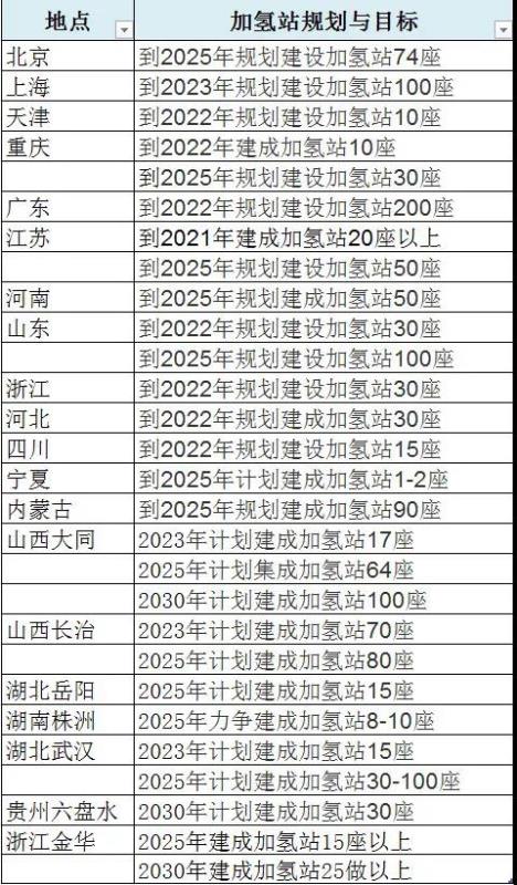 部分省份及市級加氫站建設規(guī)劃