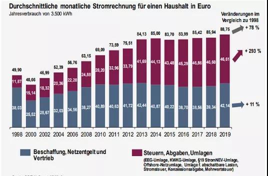 圖3所示,德國近20年批發(fā)市場的基準(zhǔn)價(jià)分別從2000年的每兆瓦時(shí)17.2歐元上漲到2019年的42.2歐元,尖峰價(jià)格更是在2008年沖到了129歐元,近十年基本保持在30至70歐元之間。從圖4可看出,從1998年至2019年電價(jià)78%的漲幅中,發(fā)電和輸電、配電成本只增長了11%,各種稅費(fèi)上漲近293%。德國的居民電價(jià)里,各種稅費(fèi)(再生能源補(bǔ)貼、增值稅、電力稅、公共土地費(fèi))貢獻(xiàn)了超過一半。其中,再生能源補(bǔ)貼就占了電價(jià)的21-23%,該項(xiàng)補(bǔ)貼從2006年的約0.8歐分/千瓦時(shí)增至2019年每千瓦時(shí)6.405歐分/千瓦時(shí)。