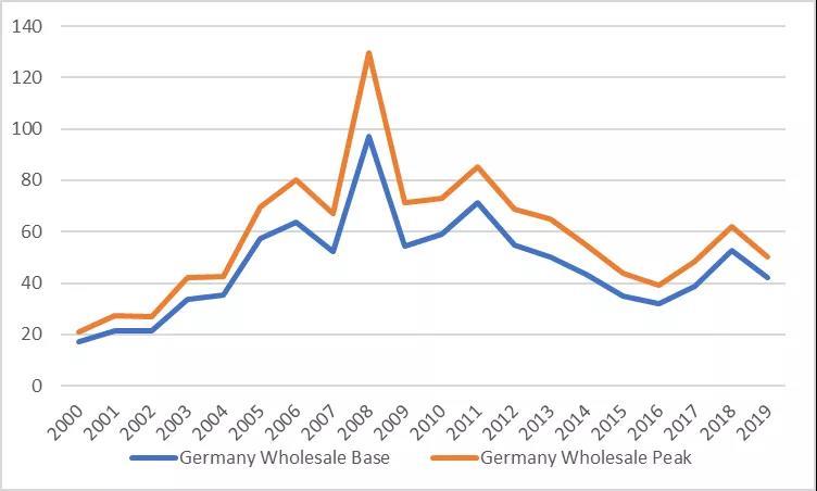 圖 3 德國近20年現(xiàn)貨市場基準(zhǔn)價(jià)格及尖峰價(jià)格(單位:歐元/MWh)
