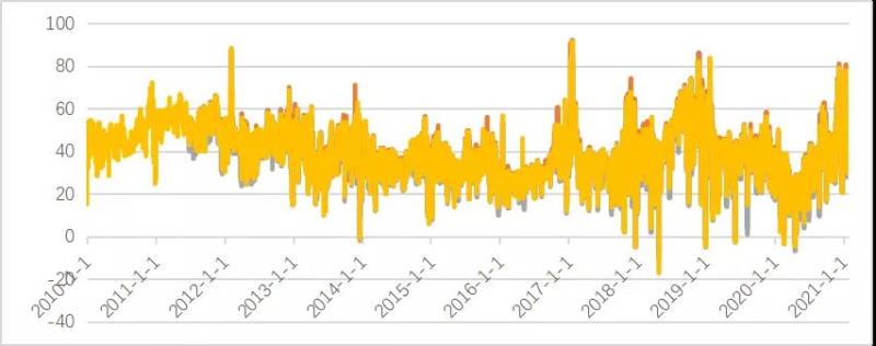 圖 2 德國日前電力市場價(jià)格(2010-2021,單位:歐元/MWh)