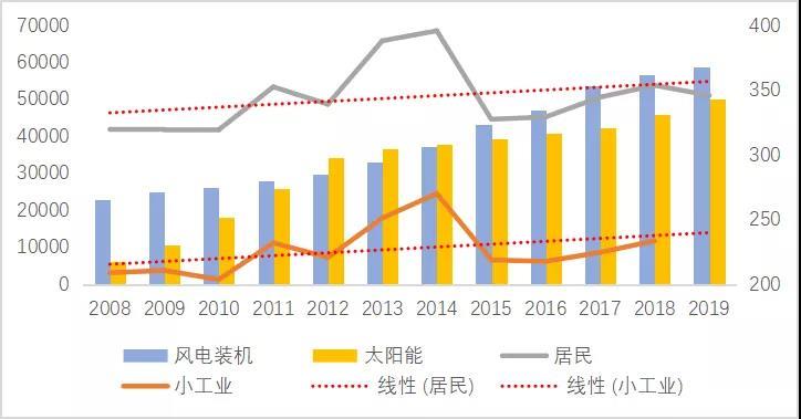 圖 1德國風(fēng)光裝機(jī)變化與居民和小工業(yè)電價(jià)的變化情況(2008-2019)