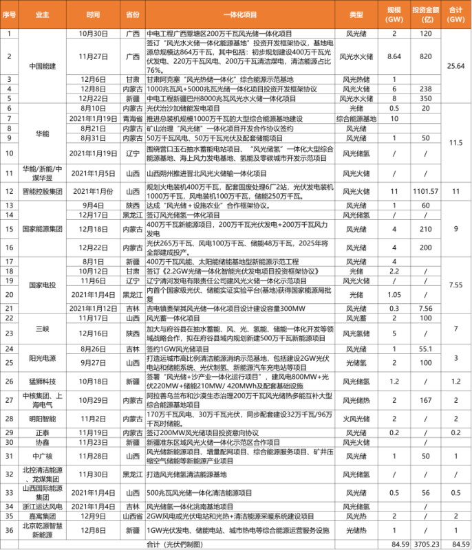 據(jù)光伏們根據(jù)公開資料不完全統(tǒng)計(jì),2020年下半年至今有36個(gè)一體化項(xiàng)目簽約落地,規(guī)劃總規(guī)模近85GW,投資總額超過3700億,且因地制宜,形式多樣,包括風(fēng)光水火儲(chǔ)、風(fēng)光儲(chǔ)、風(fēng)光儲(chǔ)氫一體化等等。
