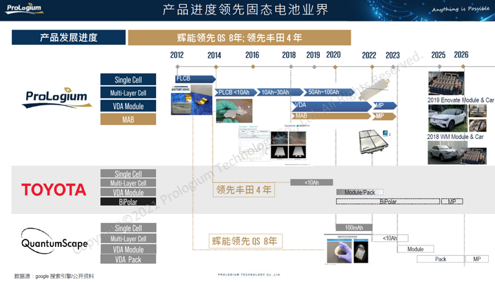 跟競(jìng)爭(zhēng)對(duì)手相比,我們?cè)?016年就已經(jīng)有試產(chǎn)線建成,比TOYOTA領(lǐng)先了六年,領(lǐng)先了QuantumScape7年。我們?cè)趦?nèi)地有2GWh建制的計(jì)劃,在最近這一兩個(gè)月里大家就可以聽(tīng)到我們進(jìn)一步的好消息,接下來(lái)明年就會(huì)有2GWh的工廠建成并預(yù)計(jì)于2023年擴(kuò)產(chǎn)至7GWh的產(chǎn)能。在產(chǎn)品的部分Quantumscape今年提出了100毫安培的產(chǎn)品,我們?cè)?012年就有了,所以說(shuō)從產(chǎn)品建設(shè)方面來(lái)看我們也是領(lǐng)先Quantumscape8年多的時(shí)間,而Quantumscape目前只有single layer技術(shù),但我們的multilayer我們已經(jīng)成功在市面上使用,然后又取得了安規(guī)認(rèn)證,再加上我們甚至也可以把這個(gè)pouch電池應(yīng)用到VDA上面也可以。整個(gè)產(chǎn)品經(jīng)過(guò)7年在市場(chǎng)上面的驗(yàn)證,所以在產(chǎn)品的成熟度上都是相較于其他固態(tài)電池要成熟,也因?yàn)檫@樣我們也獲得了國(guó)際的肯定,包括愛(ài)迪生獎(jiǎng)以及美國(guó)CES創(chuàng)新發(fā)明獎(jiǎng)。