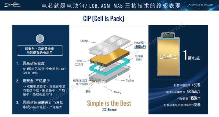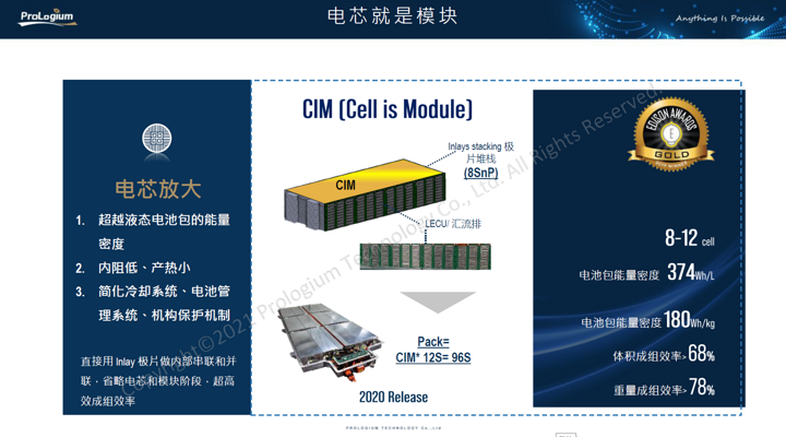 另外一個(gè)我們想做的是CIP,因?yàn)槲覀冊(cè)?019年把CIM成功做出來(lái)并且取得美國(guó)愛(ài)迪生的金獎(jiǎng),我們有很大信心把CIM變成CIP(cell is pack)電池包,在電芯和電池包的部分同步提升能量密度還有續(xù)航里程和CIP這樣的設(shè)計(jì),在成本的部分我們可以極簡(jiǎn)冷卻系統(tǒng)封裝、BMS的管理系統(tǒng),節(jié)省出很多模組工藝制程,我們直接拿極片堆疊成一電池包,他基本上通過(guò)這個(gè)方式讓內(nèi)阻降到很低,冷卻系統(tǒng)也會(huì)變得很簡(jiǎn)單,成本也會(huì)隨之大幅下降。我們估算了一下,當(dāng)我們整個(gè)產(chǎn)能達(dá)到7GWh的時(shí)候搭配上CIP技術(shù),成本即可相當(dāng)于NCM622的成本,當(dāng)我們把整個(gè)產(chǎn)能再往上提升到15GWh的時(shí)候搭配上CIP技術(shù),成本即可跟811相當(dāng),這也是我們希望CIP固態(tài)電池能夠做到的終極目標(biāo)。