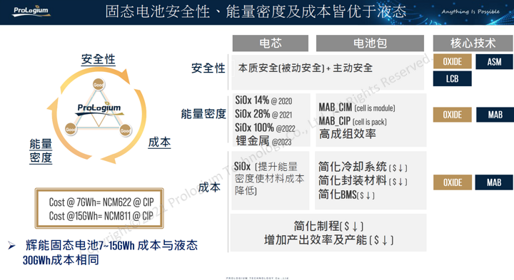 如果要從液態(tài)膠態(tài)進(jìn)展到固態(tài)有一個(gè)很大的差異,我們從圓柱到角柱都有30%工藝上的差異,那從軟包再到固態(tài)電池又有60%以上工藝制備上的差異,所以說(shuō)在這樣的理解之下我們來(lái)看自己的固態(tài)電池,有三個(gè)點(diǎn)是非常重要的,也是最基礎(chǔ)的,就是安全性、能量密度還有成本。在安全性部分,因?yàn)槲覀冇玫氖茄趸锕虘B(tài)電解質(zhì),是所有固態(tài)電解質(zhì)中最穩(wěn)定的系統(tǒng),我們就可以不斷使用高活性的材料提升能量密度,然后降低電芯成本。