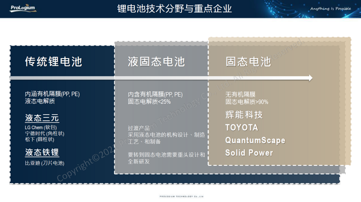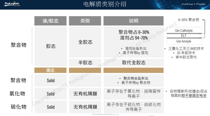 相較于傳統(tǒng)鋰電池和液固態(tài)電池,固態(tài)電池有90%以上都是固態(tài)電解質(zhì),剩下1~10%可能就是在其他極層部分有其他混合或者是全固態(tài)都是屬于這個(gè)領(lǐng)域里面的。在這個(gè)固態(tài)電解質(zhì)大于90%的固態(tài)電池里面,前幾大都是這幾個(gè)主要的代表之一。相較于這兩種之外,還有一種是介于中間的過(guò)渡性產(chǎn)品,它是基于液態(tài)電池的架構(gòu)做的一個(gè)改良,其固態(tài)電解質(zhì)小于25%。如果從整個(gè)電解質(zhì)的角度去做分類(lèi)可以看到,聚合物、氧化物還有硫化物三種,所以基本上要分膠態(tài)跟液態(tài)有一個(gè)簡(jiǎn)單的點(diǎn),我們?nèi)タ此}類(lèi)分解的部分到底是因?yàn)槿軇﹩?dòng)的還是聚合物啟動(dòng),如果從溶劑啟動(dòng)就是膠態(tài),如果是聚合物啟動(dòng)那就是固態(tài)。另外離子移動(dòng)的部分也是一樣,如果是溶劑驅(qū)動(dòng)就是膠態(tài),全膠態(tài)的技術(shù)在20年前被半膠態(tài)給取代。