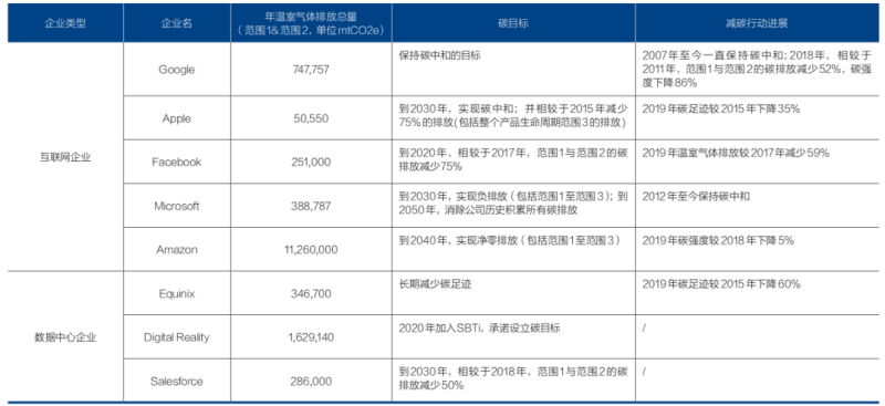 互聯(lián)網(wǎng)公司的碳排放主要來自其電力使用,使用零排放的可再生能源是減排主要手段。歐美科技巨頭大都已確立在2025年前 100% 使用可再生能源的目標(biāo)。