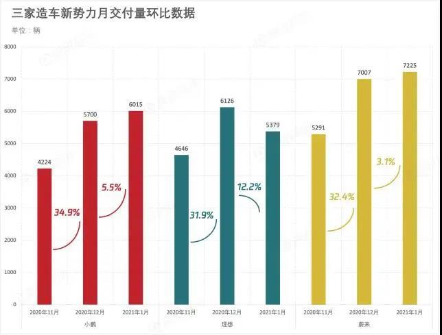 根據(jù)三家車企官方數(shù)據(jù)顯示,2021年1月,三家車企中交付量最高的依然是蔚來,1月交付了7225輛車;小鵬交付6015輛汽車,位列第二;理想汽車交付了5379輛車,盡管依然是單一車型交付冠軍,但環(huán)比增速在三家里是唯一負增長的。