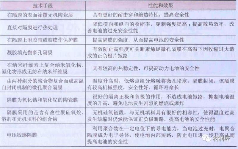 隔膜垂直方向上的機(jī)械強(qiáng)度越高,電池發(fā)生微短路的概率就越??;隔膜的熱收縮率越小,電池的安全性能越好。隔膜的微孔關(guān)閉功能也是改進(jìn)動(dòng)力電池安全性的另一方法;凝膠類聚合物電解質(zhì)具有較好的保液性,采用這種電解質(zhì)的電池比常規(guī)液態(tài)電池具有更好的安全性;除此,陶瓷隔膜也可以改進(jìn)電池的安全性。常見(jiàn)的國(guó)內(nèi)專利文獻(xiàn)對(duì)鋰電池隔膜的制備和處理類型,見(jiàn)下表。