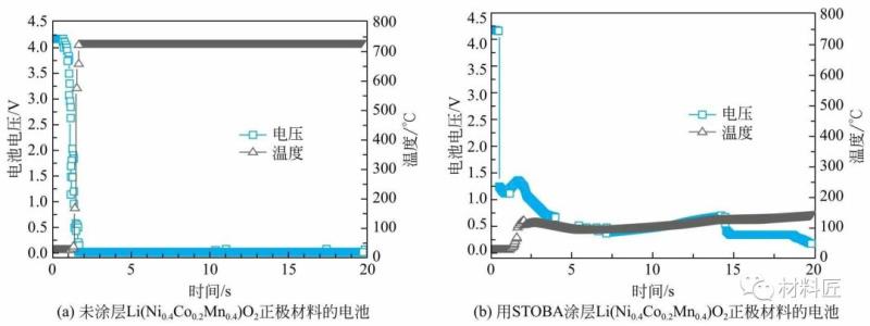上圖采用一種納米級(jí)樹(shù)枝狀結(jié)構(gòu)的高分子化合物(STOBA)對(duì)NCM(424)進(jìn)行涂層,當(dāng)鋰電池發(fā)生異常,產(chǎn)生高溫時(shí),會(huì)形成一道薄膜阻隔鋰離子間的流動(dòng),穩(wěn)定鋰電池,借以提高電池安全度。由下圖可見(jiàn),針刺實(shí)驗(yàn)時(shí),正極材料未涂STOBA涂層的電池內(nèi)部溫度在幾秒鐘內(nèi)升至700℃,而用STOBA涂層正極材料的電池溫度最高只有150℃。