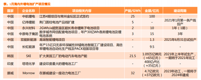 天風(fēng)證券鄒潤芳團(tuán)隊(duì)2月1日報(bào)告指出,從建設(shè)周期看,多數(shù)項(xiàng)目為分期建設(shè),首期項(xiàng)目多于2021年內(nèi)建成或試投產(chǎn),基本在2024年之前完全建成。從1月的擴(kuò)產(chǎn)項(xiàng)目可以看出,一方面目前頭部企業(yè)仍為擴(kuò)張主力,中航鋰電和億緯鋰能擴(kuò)產(chǎn)產(chǎn)能超過30GWh;另一方面,海外企業(yè)正在加速追趕,產(chǎn)能規(guī)模加大。