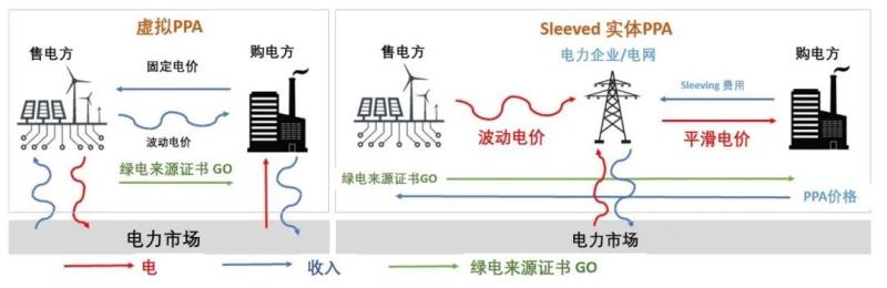 售電和用電方還可以同時參與電力市場,前者售電,后者從供電公司購電。相比之下,實體PPA雖然也可以參用電力企業(yè)向購電方收取sleeve中介費用的方式,來把售電側(cè)的波動電價轉(zhuǎn)為平滑的固定價格曲線,同時售電方提供綠證,但是靈活性還是不如虛擬PPA。