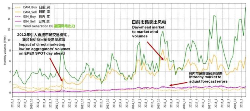 從德國電力交易量數(shù)據(jù)也可以看出集合競價商代表的可再生能源發(fā)電商參與現(xiàn)貨市場的動態(tài)走勢。2012年德國引入“直接市場交易”模式之后,集合競價商在日前市場的交易量激增,每月可以達到風力發(fā)電的70%以上,說明大多數(shù)風電場參與了交易。每月的風力發(fā)電量從2010年的3 TWh,隨著風電裝機的增加持續(xù)上升,在2019年達到了16 TWh。日前市場出售風電(黃線)的投標量和風電出力趨勢(綠線)也大致一致。同時,可再生能源發(fā)電商再利用日內(nèi)市場(紫線)繼續(xù)調(diào)整預測誤差(綠線和黃線之間的差值),減少潛在的不平衡費用。