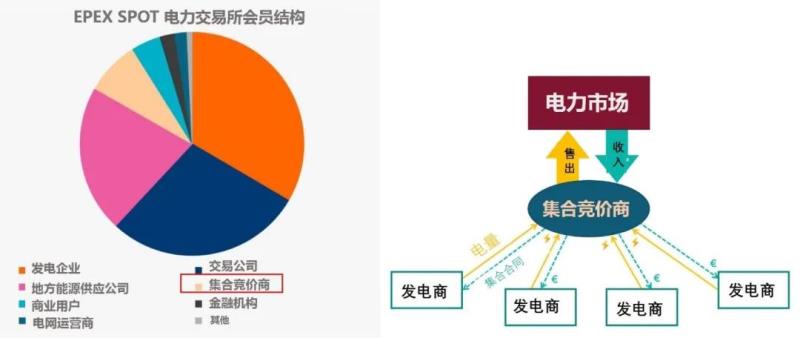 EPEX SPOT交易所目前約有300名會員參與交易,大致可以分為發(fā)電企業(yè),金融機構(gòu),用戶,電網(wǎng)運營商,和集合競價商Aggregator等。交易所一般都設定一定的準入條件,而集合競價商的引入,便利了小型可再生能源發(fā)電商參與電力交易,作為他們的代理,協(xié)助如小型風電場在市場售電和管理平衡成本風險。