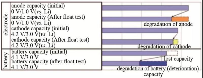 電池材料是組成電池的基礎部分,材料的性能和結構極大地影響著電池的特性,穩(wěn)定的內部材料保證著電池的健康運行狀態(tài)以及使用安全。然而在長時間的浮充電運行工況下,電池材料會表現(xiàn)出不穩(wěn)定性,其結構發(fā)生改變或破壞,從而導致鋰離子電池的浮充失效,使得電池的安全性變差,使用壽命縮短。