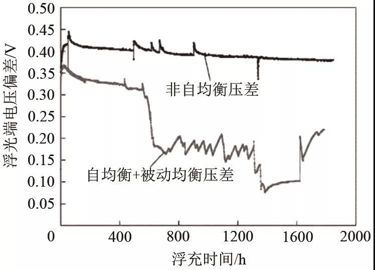 段周敬等為減少長期浮充狀態(tài)造成的電池單體不一致性對電池組容量和壽命的影響,設計了主動和被動均衡相結合的控制策略,以軌交儲能磷酸鐵鋰電池為試驗對象,并進行對比測試研究。試驗結果與楊忠亮等人的相一致,在添加均衡控制策略后,可以明顯地降低電池浮充狀態(tài)的電壓偏差。