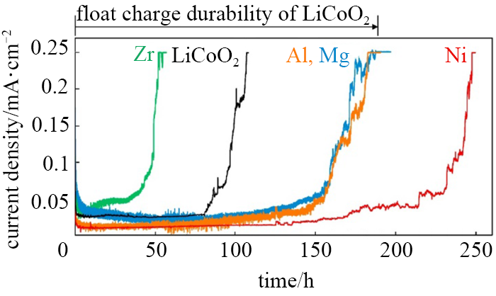 Hirooka等以鈷酸鋰電池為對象,研究了不同金屬取代鋰鈷氧化物的高壓浮充耐久性試驗,金屬包括Co、Ni、Al、Mg和Zr,在4.5 V和60 ℃的條件下進行浮充。試驗結果如圖6所示,通過電流增加至0.25 mA/cm2的時間來定量定義浮充耐久性。材料的浮充耐久性隨取代金屬離子的不同而變化,順序為鎳>鋁>鎂>鈷>鋯,當鎳以5%的量代替鋰鈷氧化物時,與鈷酸鋰相比,浮充電耐久性提高了4倍以上,而能量密度沒有降低。