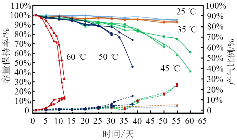 李懿洋采用MACCOR充放電設備對正極材料為鈷酸鋰、負極材料為石墨的軟包電池進行全電池浮充測試試驗。恒定浮充電壓4.35 V、溫度25~60 ℃下進行測試,為保證試驗準確性和避免電池一致性的影響,每個測試選用3~4個電池,試驗結果如圖5所示。實驗結果表明,電池在25 ℃和35 ℃浮充55 d后容量保持率仍在95%左右,無明顯衰減,而當浮充溫度繼續(xù)升高時,電池容量衰減迅速加快。他還發(fā)現(xiàn)高溫浮充下電池容量衰減曲線可以分為兩段,在浮充35 d之前,容量衰減和時間呈現(xiàn)近似線性關系,而35 d以后容量衰減速度明顯加快,此時正好是電池產(chǎn)氣的起始點,所以衰減加快是溫度升高導致電解液分解和副反應加劇而引起。