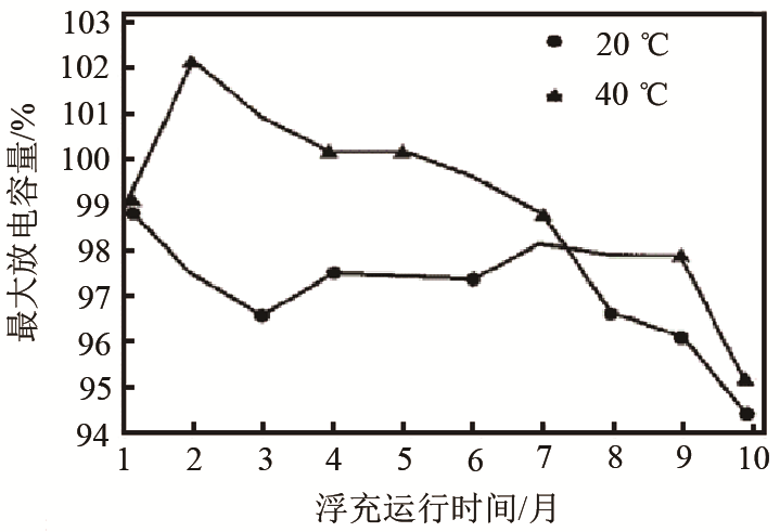 齊明輝等以單體額定容量為7.8 A·h的FBL磷酸鐵鋰電池為研究對象,在額定電壓為3.6 V下,進行不同溫度的浮充電容量測試實驗,結果如圖3、圖4所示。發(fā)現(xiàn)溫度低于0 ℃時,放電容量衰減迅速;溫度低于常溫進行浮充時,容量衰減速度加快,電池使用壽命縮短。隨著溫度升高,放電容量逐漸恢復;但是當溫度高于40 ℃后,電池會出現(xiàn)過放現(xiàn)象。同時在20 ℃和40 ℃的不同溫度下進行浮充電時容量衰減速度也有差異,其在不同溫度下容量衰減的參照組設置較少。