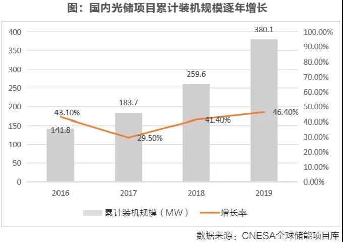 近兩年,國內(nèi)光儲項目發(fā)展迅速,年增長率高達40%。根據(jù)中關村儲能產(chǎn)業(yè)技術聯(lián)盟(CNESA)全球儲能項目庫的不完全統(tǒng)計,截至2019年底,中國已投運光伏配置儲能項目累計裝機規(guī)模達到380.1MW,占中國電化學儲能投運項目總規(guī)模的22.6%,年增長率為46.4%。