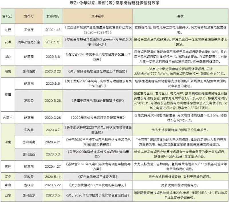 今年上半年,湖北、湖南、新疆、內(nèi)蒙古、山西、山東等?。▍^(qū))相繼發(fā)布政策,優(yōu)先支持或要求新建風電和光伏項目配備儲能,儲能配置比例在5%~20%之間,儲能時長為1-2小時。