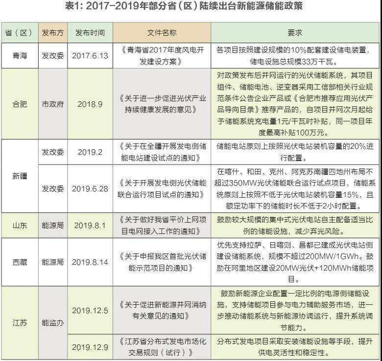 新能源配儲能并不是新鮮事物。早在2017年,青海省發(fā)改委便在《2017年度風電開發(fā)建設方案》中提出,列入青海省2017年度風電開發(fā)建設方案的43個項目按照建設規(guī)模的10%配套建設儲電裝置,儲電設施總規(guī)模0.33GW。2019年,新疆、山東、西藏、江蘇等省(區(qū))也陸續(xù)出臺政策,鼓勵或要求新能源項目配備儲能設施。(見表1)