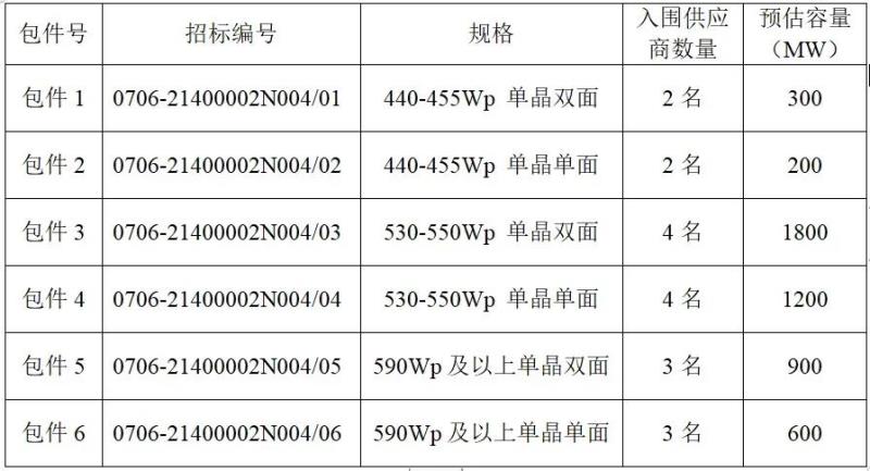 根據(jù)招標(biāo)公告,本次組件框架招標(biāo)采購為服務(wù)于中核匯能有限公司/中核山東能源有限公司/中核豐泰新能源開發(fā)有限責(zé)任公司/其他與中核匯能有限公司一體化管理的機(jī)構(gòu)及所屬項目公司2021年12月31日前的擬開工項目(包括自主投資建設(shè)項目和擬收購項目),預(yù)計裝機(jī)總量為5GW。招標(biāo)范圍包括(但不限于)光伏組件產(chǎn)品本體、運輸供貨到項目現(xiàn)場及保險費(運輸費標(biāo)注出單價)、專用工具、備品備件、指導(dǎo)安裝組件設(shè)備、配合系統(tǒng)調(diào)試和驗收、培訓(xùn)及其它相關(guān)服務(wù)等費用。