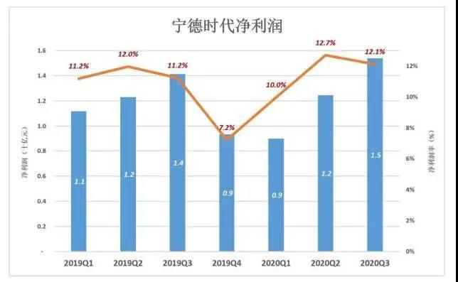2020年Q3,寧德時代凈利潤達到創(chuàng)紀錄的15.4億(凈利潤率12.2%),同比增長8.8%。