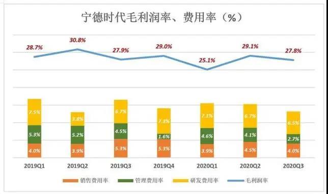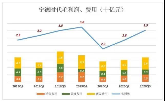 寧德時代在毛利潤率梯次下降的同時,實現(xiàn)了毛利潤總額的持續(xù)增長。2020年前三季,毛利潤分別為23億、28億、35億,而銷售、研發(fā)、管理費用分貝14億、15億、16.8億。