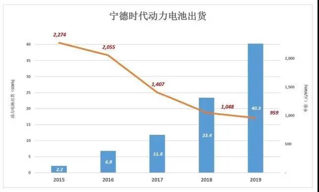 出貨量暴漲的同時,動力電池單價則一降再降。2019年寧德時代動力電池出貨40.25GWh、收入385.8億,每度電容量成本985.6元,較2018年降低8.5%、僅為2016年的46.6%。一輛動力電池容量為80KWh的純電動車(續(xù)航里程500公里左右),2016年為16.44萬元、2018年降至8.38萬元、2019年只要7.67萬元。