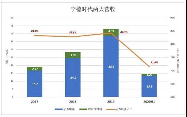 寧德時代將主營業(yè)務分三部分披露:動力電池、鋰電池材料和儲能系統(tǒng),前兩項是主要收入來源。儲能業(yè)務2017年上馬,2018年收入暴漲十倍、達到1.9億,占總營收的0.6%;2020年H1收入達5.7億,占營收的3%。
