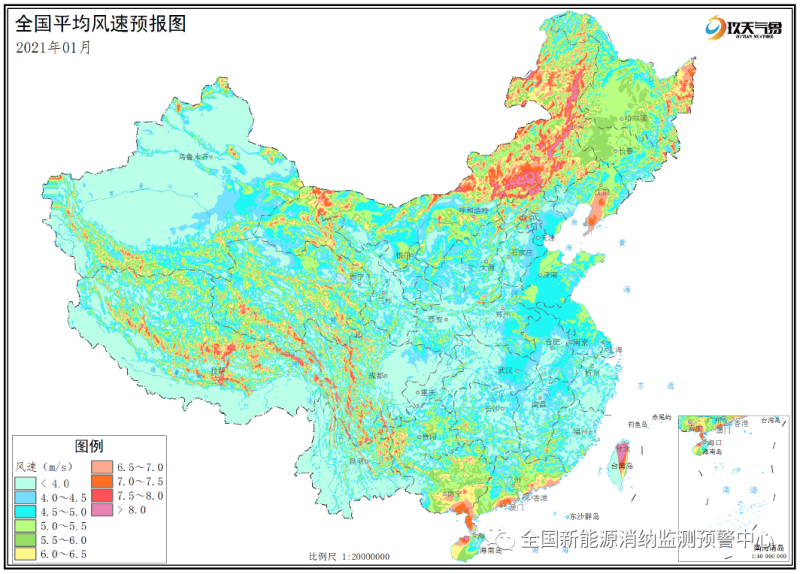 附圖1 全國2021年1月平均風(fēng)速分布預(yù)報圖
