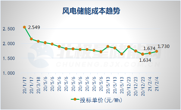 2020年12月,中能建湖南院以單價1.634元/Wh中標三峽新能源湖南道縣洪塘營風(fēng)電場10MW/20MWh儲能示范項目EPC總承包工程,再創(chuàng)風(fēng)電儲能EPC單價最低記錄!據(jù)統(tǒng)計,2020年截至目前共有7個風(fēng)電儲能項目中標價格公示,風(fēng)電儲能中標單價從1月份的最高2.549元/Wh降至了目前最低1.634元/Wh,一年內(nèi)降幅達35.9%。